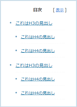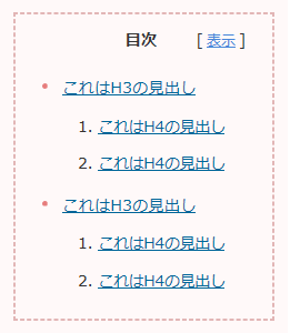 勿論、マウスで「目次設定」メニューを選択してデザインや色を決めたりする等の最低限の設定は必要ですが、SIRIUSはアンカー(目印)としてページ内見出しタグ(H2、H3、H4、H5等)を自動で判別します。そして、その見出しタグで囲まれたテキストを目次として自動で表示するのです。